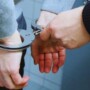 A person is shown from behind with their hands cuffed as an officer secures handcuffs during an arrest.